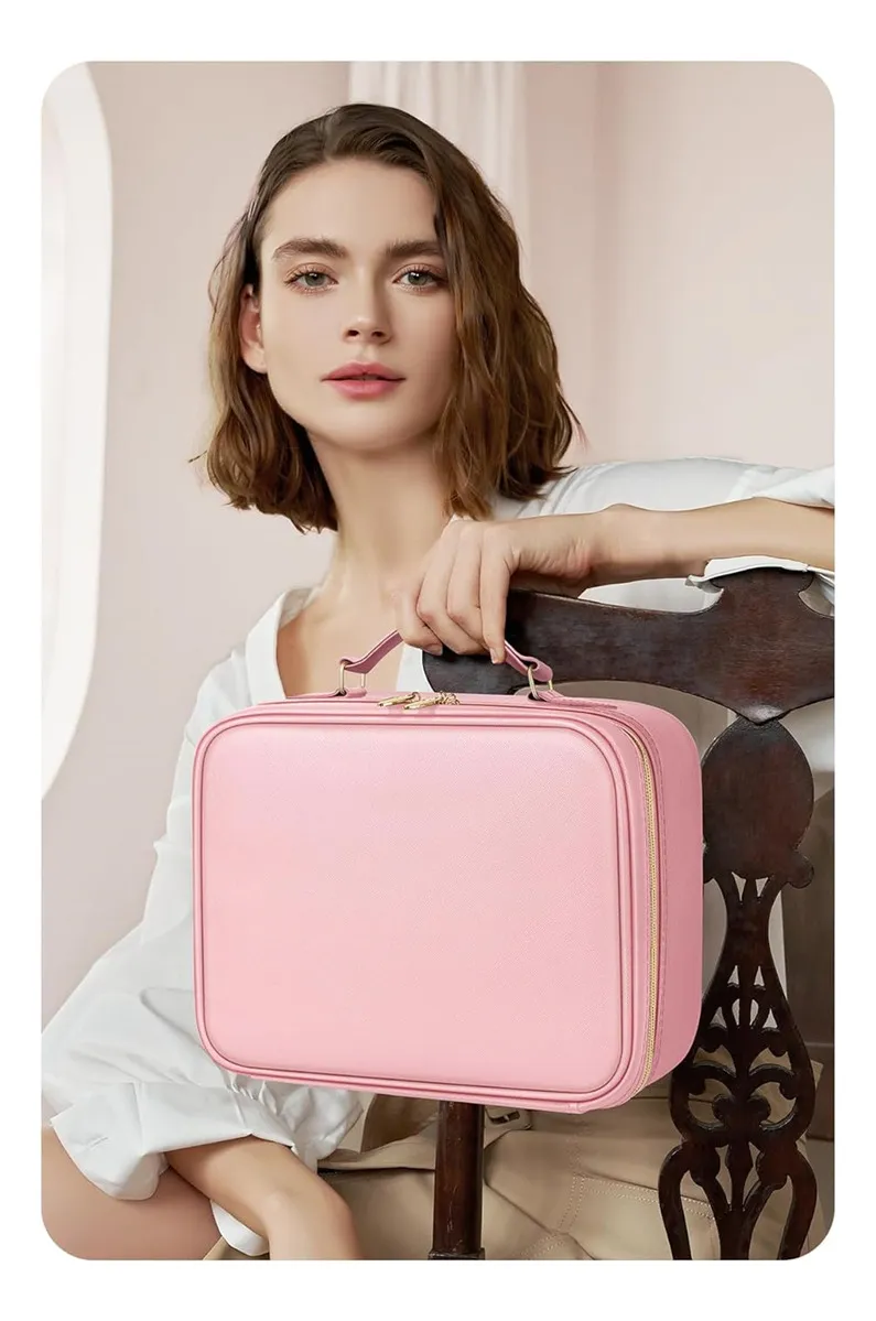 INNOVADOR BOLSO DE MAQUILLAJE PORTÁTIL. Bolsa de maquillaje de viaje de gran capacidad hecha de cuero PU: impermeable, duradera y fácil de limpiar. Con un forro de fibra de carbono para mejorar la estética y la durabilidad. Equipado con un espejo de maquillaje LED de 3 colores, elaborado con materiales de alta calidad y diseño ergonómico. Ideal para viajes o actividades profesionales, facilita su transporte sin esfuerzo.
