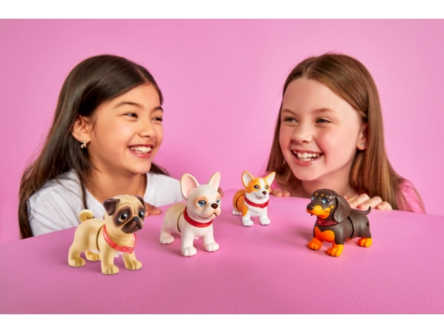Cada figura incluye collar brilloso desmontable, ojos plásticos brillantes y packaging tipo kennel que funciona como su casita