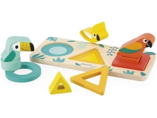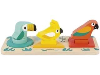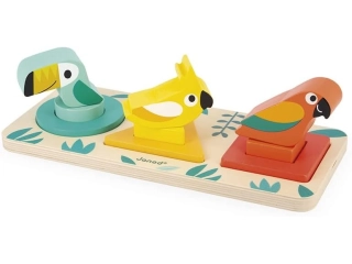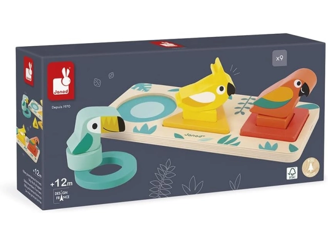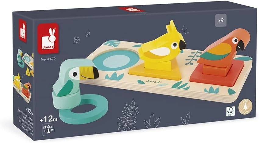 ¡Qué hermosas son estas aves tropicales! Emprende el vuelo hacia los países cálidos con este juguete de estímulo 3 en 1 hecho de madera: ¡los niños de a partir de 12 meses se divertirán durante horas!