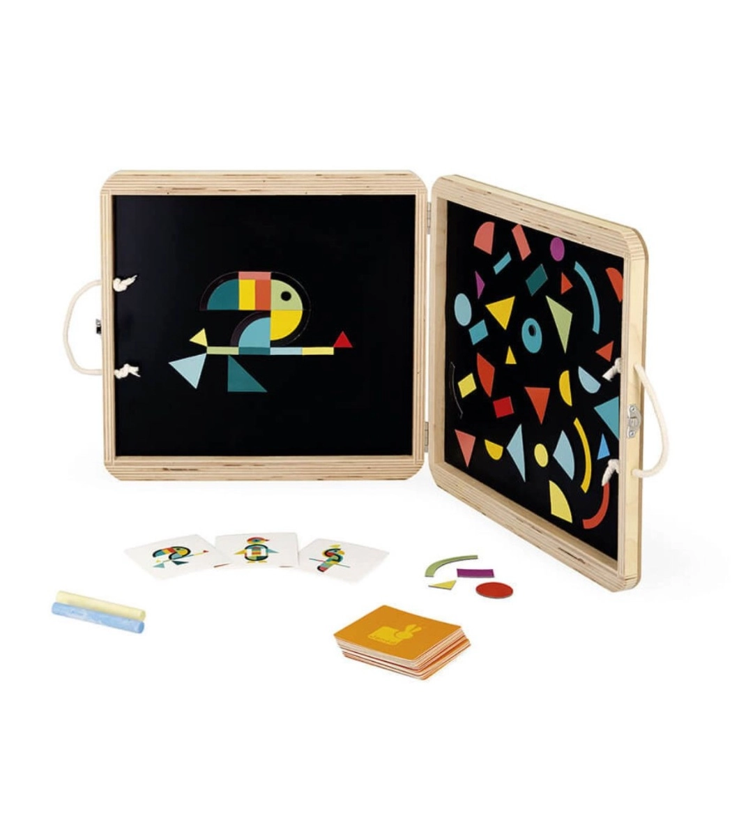 Este juego educativo de madera también le permite dar rienda suelta a su imaginación y trabajar la motricidad gracias a las superficies de pizarra y a las 2 tizas blancas incluidas. ¡Para que los niños dejen volar su imaginación como si estuvieran dibujando en un cuadro! Una vez terminado el juego, ¡basta con guardar todos los elementos y cerrar este bonito estuche de un amarillo brillante!