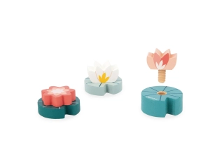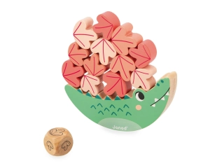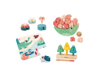 En primer lugar, un juego de equilibrio de madera con forma de cocodrilo: el objetivo es apilar encima tantas hojas de madera como sea posible, de las 12 incluidas. ¡Son de 2 tamaños diferentes para mayor dificultad! Además, el estuche incluye un juego de enroscar formado por 3 nenúfares, de varias formas y diámetros: ¡hay que encontrar la flor que va con cada hoja!