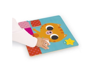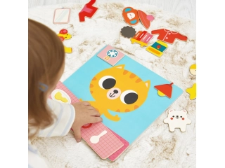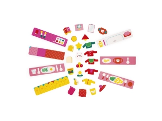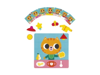 Desde levantarse hasta acostarse, pasando por las comidas y las actividades, los pequeños están acompañados por un pequeño gato pelirrojo: Bigote. Este juego magnético consta de 1 tablero grande, 30 imanes y 7 tarjetas modelo.
