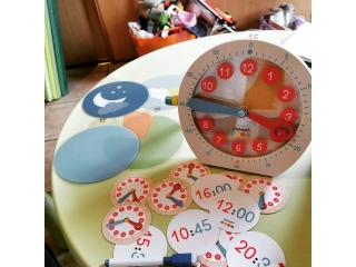 Reloj de madera y accesorios: incluye 13 tarjetas de modelo y 1 tarjeta de modelo en blanco borrable para escribir tiempos con 2 marcadores (rojo durante horas y azul durante minutos), 2 fondos para representar día o noche, y 4 pestañas para visualizar mejor 15, 30, 45 y 60 minutos.