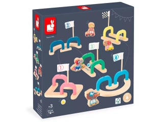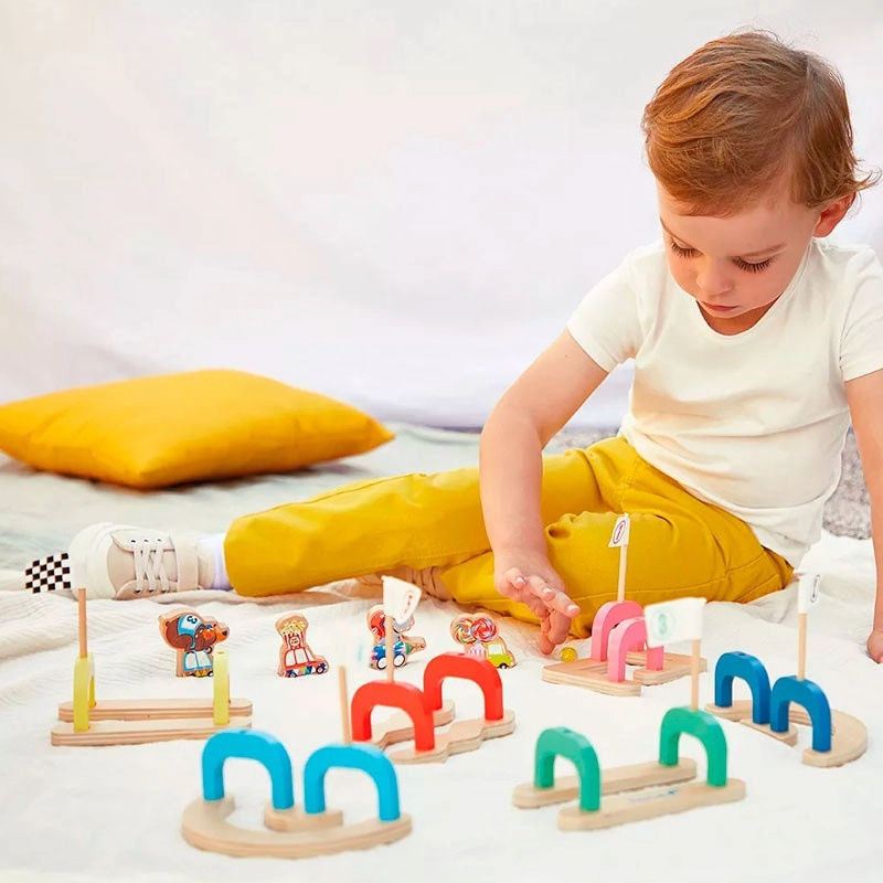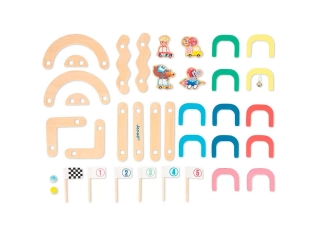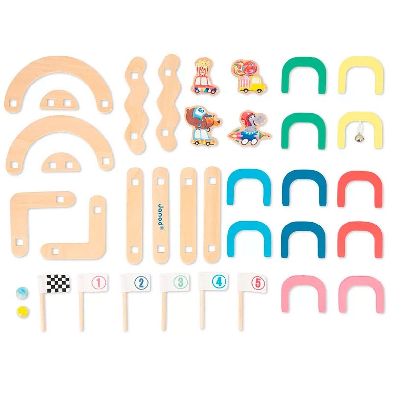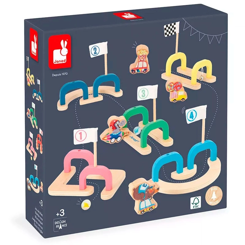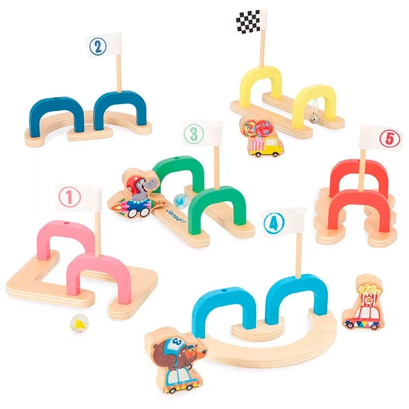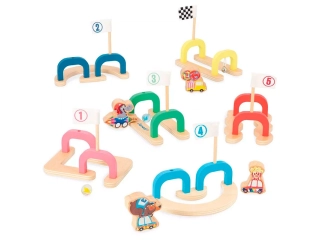 Este circuito para niños a partir de 3 años contiene: 6 puertas de paso de colores con banderas, 2 canicas de cristal y 4 fichas de vehículos de madera. El objetivo del juego es hacer rodar la canica con golpecitos para ser el primero en llegar a la meta pasando por todas las puertas numeradas. Este juego de recorrido, que admite hasta 4 jugadores.