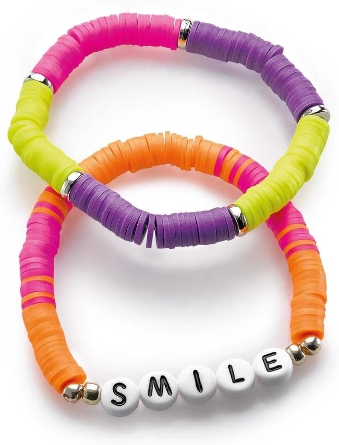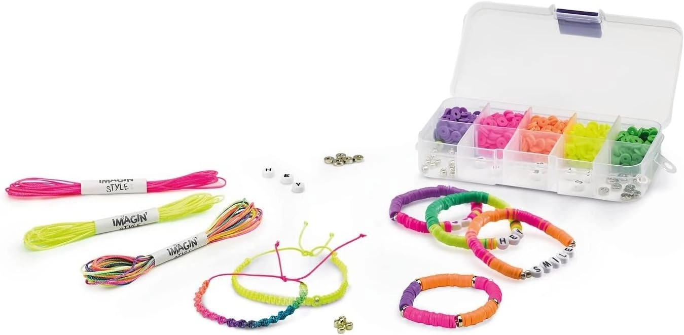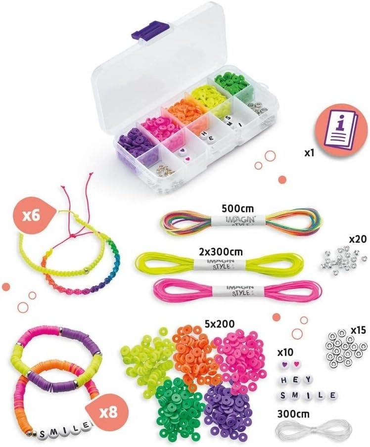 IMAGINE TU PROPIO ESTILO: Con Imagin'Style Pulseras Neon, creadas auténticas pulseras a tu imagen, únicas y coloridas. Es fácil, puedes hacer pulseras con cuentas Heishi en colores Neon. Inserta mensajes personalizados con cuentas de letra y corazón! Luego elige cuáles te llevarás según tus gustos.