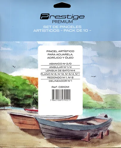 Estuche con cierre de 10 pinceles de mango corto PRESTIGE PREMIUM. Fibras sintéticas de calidad artística. Set compuesto por: 1 Abanico (#2/0), 1 Angular (#1/4), 1 Lengua de gato (#4), 4 Planos (#1, #3/4, #6, #12), 2 Redondos (#1, #6), 1 Delineador (#1). Aptos para todo tipo de pinturas. (Acrílico, óleo, acuarela)