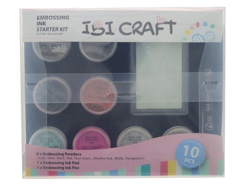 Kit para grabado en tinta y polvo en relieve IBI CRAFT compuesto por: bolígrafo de tinta de grabado en relieve, almohadilla de tinta de grabado en relieve, 8 frascos de polvo de grabado en relieve de 5grs. cada uno (Oro, Plata, Negro, Rojo, Verde Perla, Rosado Ultrafino, Blanco y Tansparente).