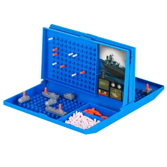 · Cantidad de piezas: 2 tableros de juego con tapa abatible - 2 sets de barcos de guerra - 2 sets de fichas anaranjadas - 2 sets de fichas blancas.
